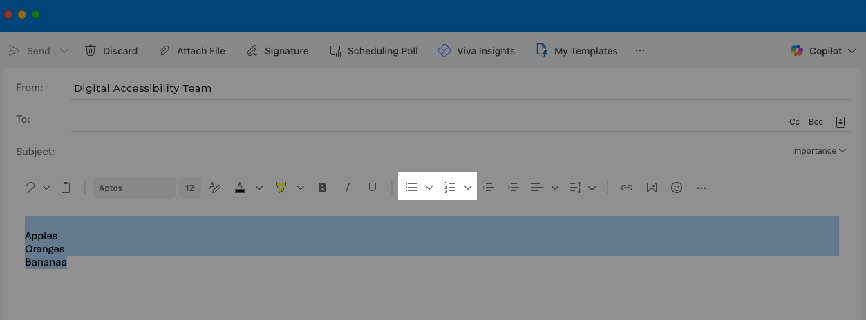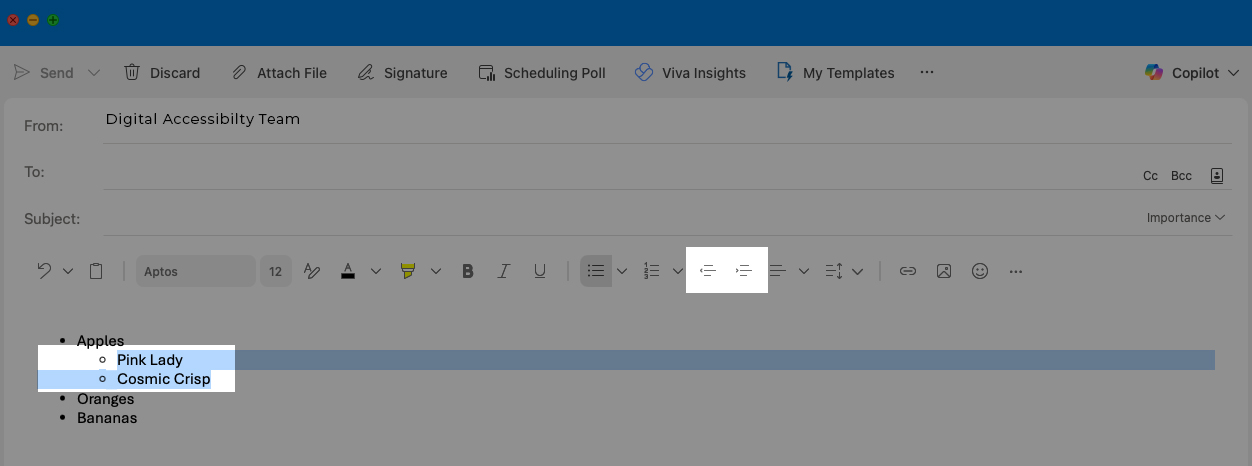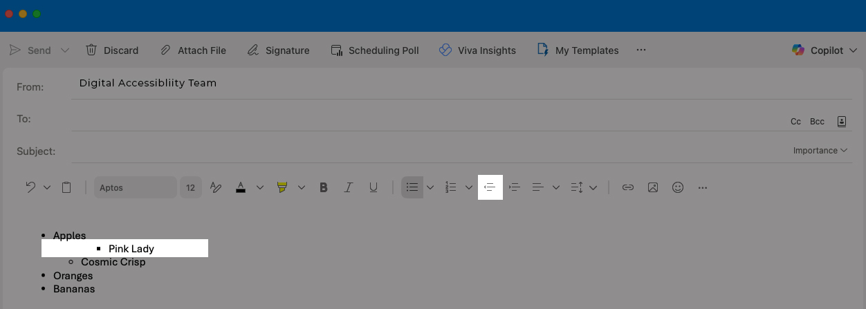 Yes, if the list was created using Outlook’s built-in List tools. Manual indentation (using the Tab key or Space bar) is not accessible.