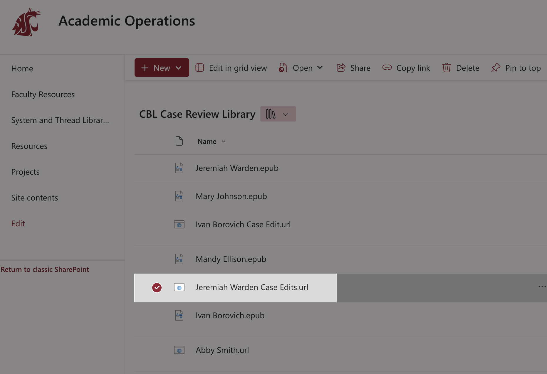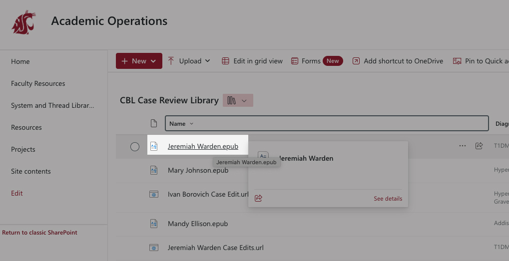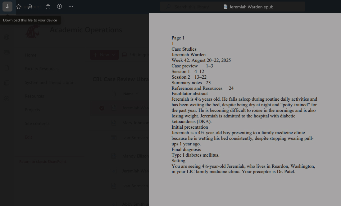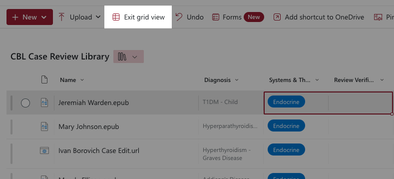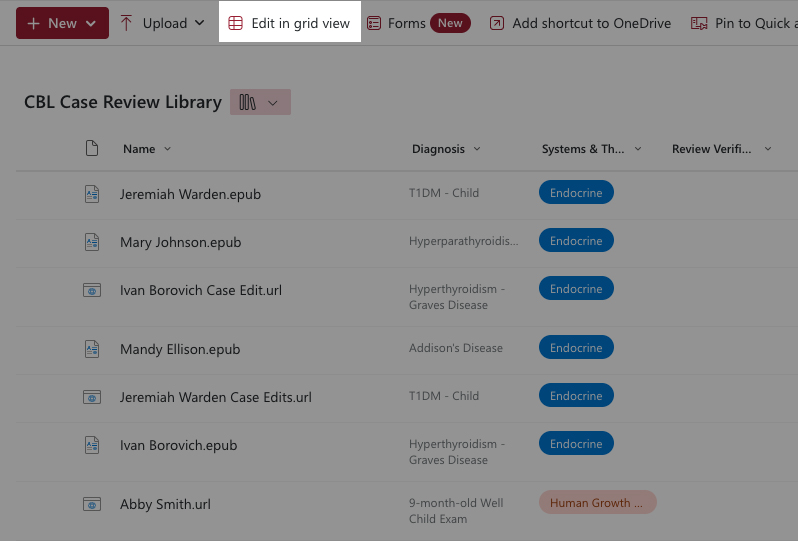 Every CBL case has an associated Word document (with the same patient’s name in the title) for recording recommended edits. In the CBL Case Review Library, double click on the Patient name case edits file. This will open the edits file in Word online. Do not download this file.